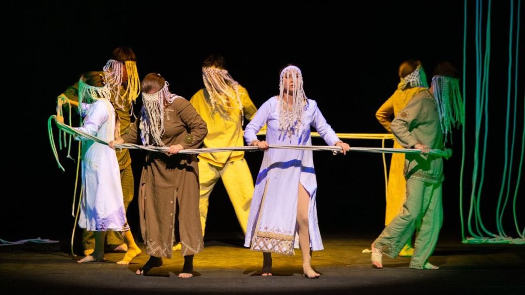 В этноспектакле «Песни небесной птицы» зритель увидит, как сначала родилась Великая Мать-Вода, затем создалась Вселенская Мать-Земля, а потом родился человек. Проживая жизнь, человек испытывает множество самых разных чувств и эмоций: он любит, завидует, разрушает, защищает, теряет, находит, верит.