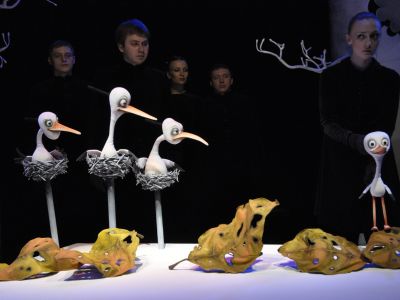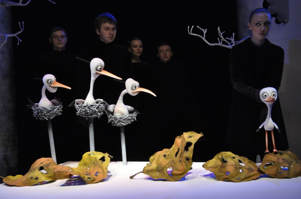 В спектакле использованы планшетные куклы. На сцене актёры работают в «живом плане».