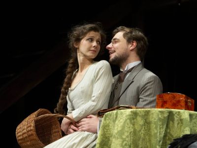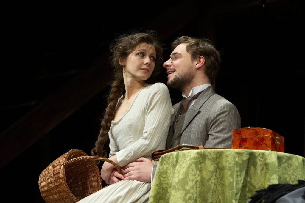 «Бесприданница» Петра Фоменко — не легкая, кружевная акварель, но строгий офорт, прочерченный сильными, резкими, точными штрихами. Приглушенные краски и предельная функциональность декораций. Острые изломы стиля модерн. Никакого мелодраматизма, разухабистого купеческого быта, томных песен и «мохнатых шмелей».