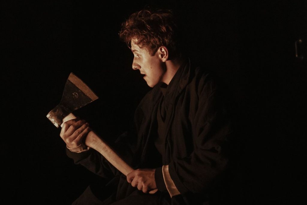 «Тварь я дрожащая или право имею?» – приблизиться к ответу на вопрос об исключительных правах личности и границах своеволия предлагает режиссёр Дмитрий Акимов (Иркутск) в спектакле Омского ТЮЗа по мотивам самого известного романа классика. В основе постановки – исследование темы «одичалой» совести, преследующей и бесконечно терзающей героев. Знакомые сюжетные линии раскрываются неожиданно, преломляясь через острый режиссерский взгляд. Это густонаселенный спектакль, в котором герои все время находятся под наблюдением друг друга, слышат собственные мысли, озвученные чужими голосами. История разворачивается вне времени и пространства – сценография лаконична, костюмы персонажей условны и монохромны.