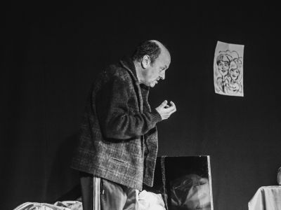 Этот спектакль об одиночестве, о потере близкого человека, о том, как трудно бывает просить прощения. Небольшая сцена, на ней бедное убранство, бросающееся в глаза, и напоминает всё это комнату: кровать, стол, стул, ламповый телевизор, покрытый пылью, детские рисунки на стене.