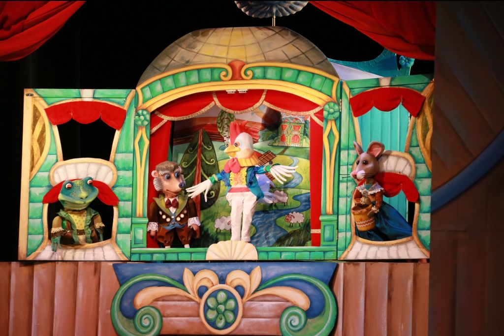 В этом спектакле много музыки, танцев, песен, которые исполняют скоморохи театра кукол.