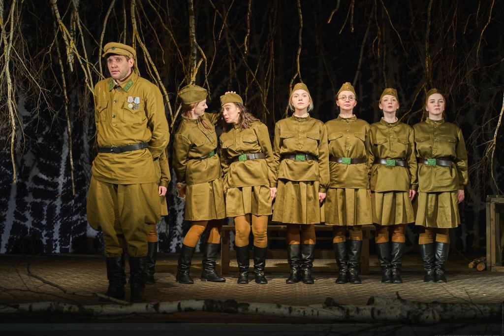 Повесть, написанная каким-то особым поэтическим языком, неоднократно экранизировалась, ставилась в театрах. Известный театральный композитор Андрей Кротов в соавторстве с либреттисткой Нонной Кротовой создал музыкальную драму «А зори здесь тихие» которая с успехом идет во многих музыкальных театрах страны. Надо сказать, что композитор Кротов является заведующим музыкальной частью театра «На левом берегу». Как же было не воспользоваться этим обстоятельством! Режиссёр спектакля использует музыку и вокальные номера композитора Кротова, не стремясь «перепеть» музыкальные театры. Хотя в театре многие артисты великолепно владеют вокалом. Режиссёр написал собственную версию инсценировки, приняв во внимание, что ставится она будет на сцене. Спектакль получился поэтичным, в нем сохранена высокая чувственность, лиричность, ярко показано стремление девушек-героинь к чистоте и любви, не смотря на разломы сурового времени. Всё это несомненно тронет души и сердца зрителей.