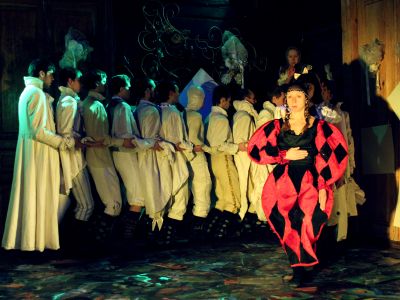 На сцене создается некий художественный мир, где костюмы, декорация, музыка — вне времени.