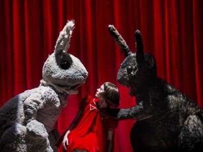 «Беги, Алиса, беги» — это настоящий экшн в самых масштабных декорациях, с огромными младенцами, гигантскими советскими чашками, ростовыми куклами, мультимедийными проекциями и стихами Владимира Высоцкого из радиопьесы «Алиса в стране чудес» на музыку современного композитора Ивана Кушнира.