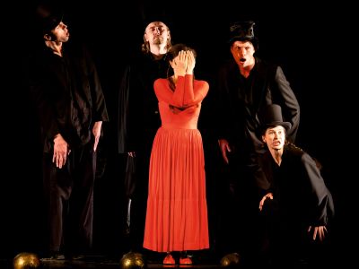 «Гроза» Андрея Могучего — это звучание подлинного, очень мелодичного текста Островского, усиленное музыкой, особым говором и ритмической сеткой русского речитатива. Это многослойные пласты русского мифа, традиций великих и порочных, вскрытых Островским и по-прежнему актуальных; это русская интерпретация классической трагедии как конфликта между долгом и чувством, безудержной страстью и неистовой верой. Это шкатулочная мистерия, житие Катерины и других обывателей волжского Калинова между адом и раем в стилизованном под палех лакированном пространстве сцены. Это метафизика темного русского царства, страшная сказка, оживающая в кромешной тьме и вопиющей черноте сценографии.