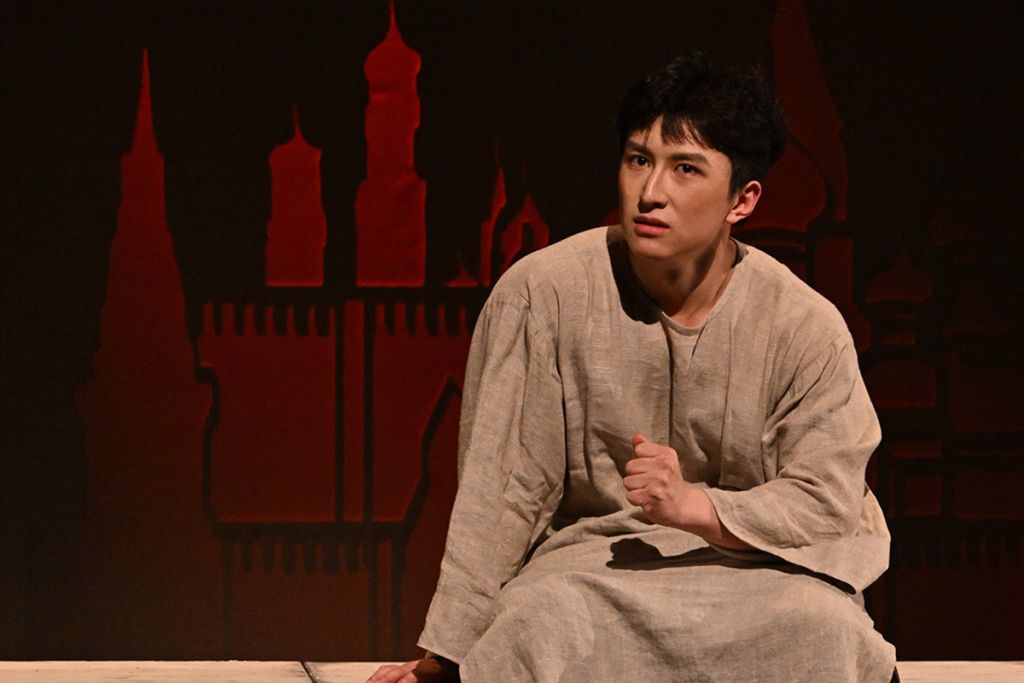 В центре спектакля — актёры, скоморохи, разыгрывающие на глазах зрителей те или иные повороты пушкинского сюжета. Магическое «если бы» становится главным законом представления. Русскую трагедию играют китайские актёры — студенты 4 курса. Это позволяет периодически использовать китайские художественные приёмы, ибо вопросы, на которые пытается ответить Пушкин, — общечеловеческие, общемировые, не связанны именно с Россией XVII века. К тому же, следуя традиции Шекспира, Пушкин в трагедии показывает много комических моментов, которые оттеняют и проявляют главный конфликт: человек и Бог, человек и судьба.