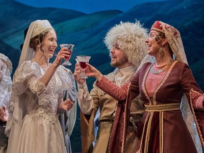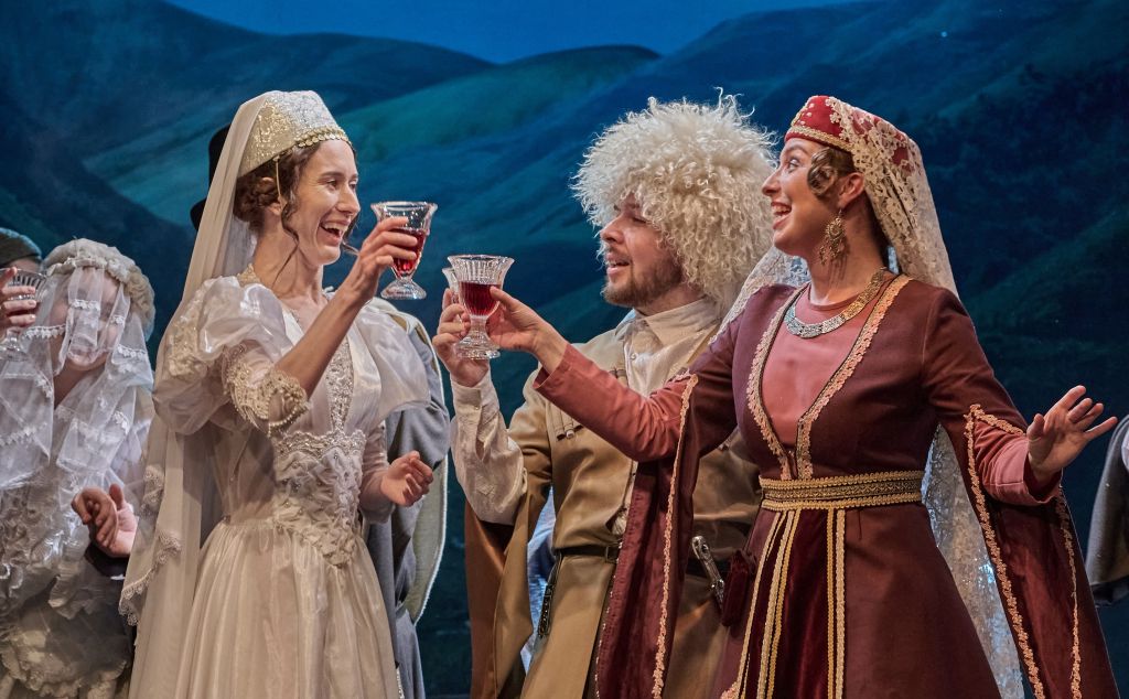 Грузинский колорит постановки проявляется абсолютно во всём. Здесь есть всё, что вспоминается при слове Грузия: тосты, песни, смех, многословное и велеречивое восхищение женской красотой, горячие темпераментные герои.