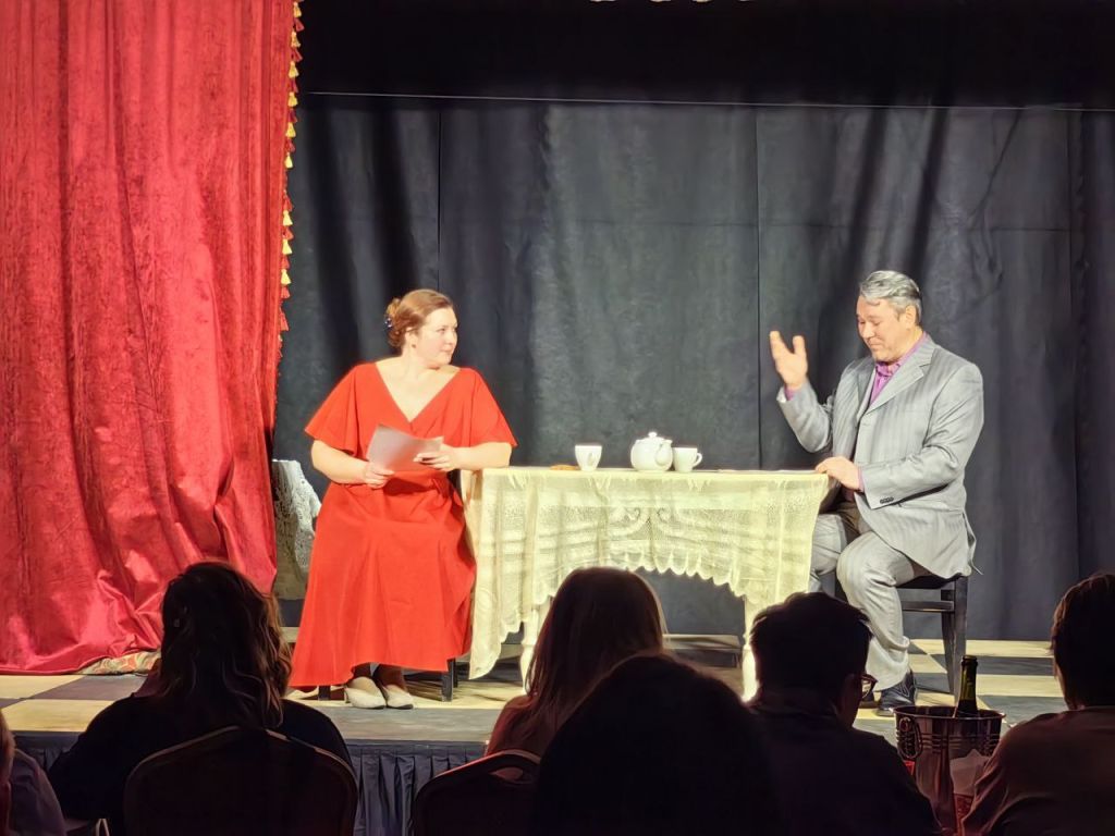 — Атмосфера театрального вечера — зрители за столами, чаепитие, смех и полное погружение в эпоху великих сатириков.