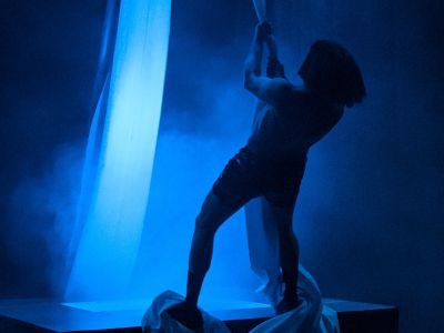 Герои спектакля живут на пружинах. Опора их существования — это: не то стол, не то детская люлька, не то плоская Земля, одиноко плывущая в окружающей тьме.