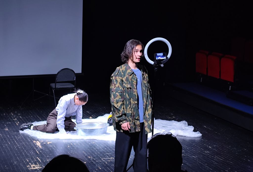 Александр Фатеев создал уникальное сценическое пространство, которое усилит драматизм происходящего. Вместо школьного класса — место, напоминающее зону карательной акции: голый пол, покрытый полиэтиленом, резкий свет и камера на штативе, транслирующая происходящее. Всё это делает атмосферу на сцене давящей и достоверной не в бытовом, а в психологическом смысле.