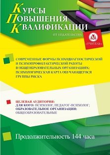 Современные формы психодиагностической и психопрофилактической работы в общеобразовательных организациях: психологическая карта обучающегося группы риска (144 ч.)