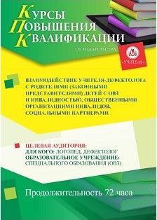 Взаимодействие учителя-дефектолога с родителями (законными представителями) детей с ОВЗ и инвалидностью, общественными организациями инвалидов, социальными партнерами (72 ч.)