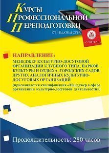 Менеджер культурно-досуговой организации клубного типа, парков культуры и отдыха, городских садов, других аналогичных культурно-досуговых организаций. Присваивается квалификация «Менеджер в сфере организации культурно-досуговой деятельности» (280 ч.)