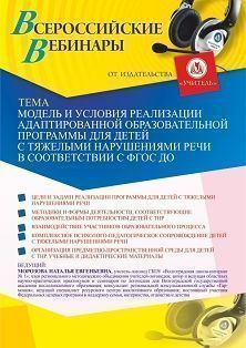 Вебинар «Модель и условия реализации адаптированной образовательной программы для детей с тяжелыми нарушениями речи в соответствии с ФГОС ДО»