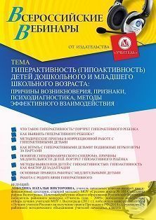 Вебинар «Гиперактивность (гипоактивность) детей дошкольного и младшего школьного возраста: причины возникновения, признаки, психодиагностика, методы эффективного взаимодействия»