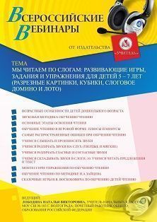 Вебинар «Мы читаем по слогам: развивающие игры, задания и упражнения для детей 5 – 7 лет (разрезные картинки, кубики, слоговое домино и лото)»