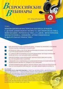 Вебинар «Инновационная мастерская логопеда в работе с детьми дошкольного возраста: биоэнергопластика, фейсбилдинг, ритмопластика, Су-Джок, звукотерапия, мнемотехника, синквейн, артикуляционная и дыхательная гимнастика»