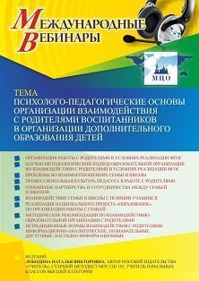 Международный вебинар «Психолого-педагогические основы организации взаимодействия с родителями воспитанников в организации дополнительного образования детей»