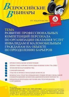 Вебинар «Развитие профессиональных компетенций персонала по организации оказания услуг инвалидам и маломобильным гражданам на объекте по преодолению барьеров»