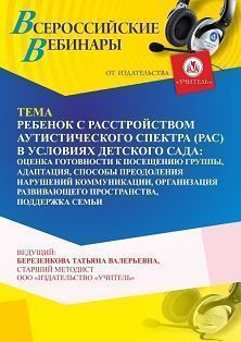 Вебинар «Ребенок с расстройством аутистического спектра (РАС) в условиях детского сада: оценка готовности к посещению группы, адаптация, способы преодоления нарушений коммуникации, организация развивающего пространства, поддержка семьи»
