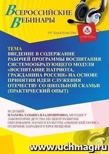 Вебинар «Введение в содержание рабочей программы воспитания системообразующего модуля “Воспитание патриота, гражданина России” на основе принятия идеи служения Отечеству со школьной скамьи (практический опыт)»