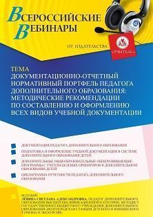 Вебинар «Документационно-отчетный нормативный портфель педагога дополнительного образования: методические рекомендации по составлению и оформлению всех видов учебной документации»