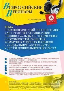 Вебинар «Психологический тренинг в ДОО как средство активизации индивидуальных и творческих способностей, развития коммуникативных навыков и социальной активности у детей дошкольного возраста»