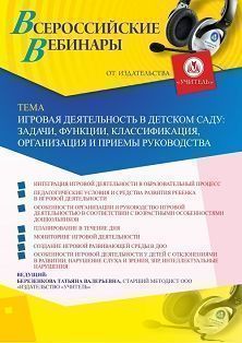 Вебинар «Игровая деятельность в детском саду: задачи, функции, классификация, организация и приемы руководства»