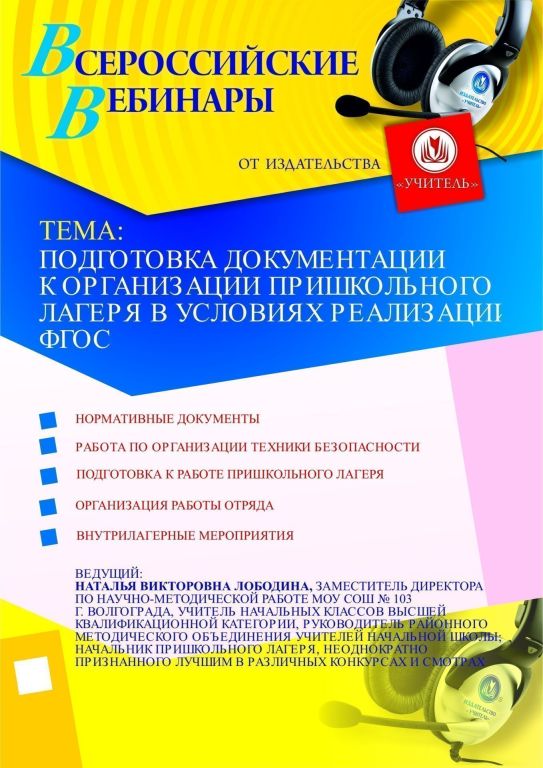 В преддверии открытия летнего оздоровительного сезона приглашаем руководителей, заместителей директора, учителей, начальников пришкольных лагерей, воспитателей, вожатых, педагогов дополнительного образования, всех, кому предстоит работать в пришкольных и загородных лагерях, принять участие в offline-вебинаре на ответственную в управленческо-организационном аспекте тему – «Подготовка документации к организации пришкольного лагеря в условиях реализации ФГОС».