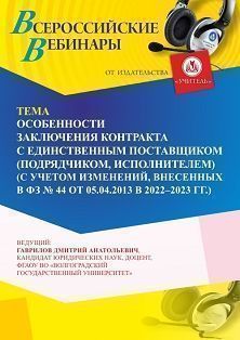 Вебинар «Особенности заключения контракта с единственным поставщиком (подрядчиком, исполнителем) (с учетом изменений, внесенных в ФЗ № 44 от 05.04.2013 в 2022 - 2023 г.г.)»