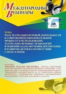 Международный вебинар «Роль театрально-игровой деятельности в современном образовательном процессе и использование театрально-игровых технологий в решении задач обучения, воспитания и развития детей в соответствии с ФГОС и ФООП»