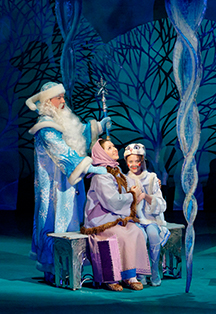 Действие первоеКартина первая "Семейка"Раннее утро в крестьянской избе. Три блошки покусывают Старика, и он во сне падает с печки. «Ох! Ох! Стар я стал и очень плох!». Жажда мучает его, а квас весь выпит. Возмущаясь, Старик будит всю семейку. Проснувшись, любимая Бабкина дочь Фроська начинает буянить. Бабка кое-как убаюкивает ее и велит Старику спать дальше. «Я не очень уже, чтобы очень… Но коль надо, какой разговор…!», – с этими словами он прыгает на печь и засыпает. Входит дочь Старика Дуняша, которая с раннего утра успела много дел переделать по хозяйству. Но мачеха все равно встречает ее бранью, а Фроська поддакивает матери. Дуняшу со скандалом гонят в лес за хворостом.Картина вторая "У Морозко в лесу"Дуняша одна в зимнем лесу. Вспомнив злую мачеху, она горько жалуется на сиротскую судьбу. Да и хвороста нигде не видать – все снегом замело. Заблудилась девочка. Появляется Волк, ища добычу. О! Вот и заяц! Начинается погоня. Дуняша, увидев, что Волк схватил зайца, решает помочь бедняге: «Стой, волк! Ты разве не знаешь, что охотник с ружьем спешит по твою душу! Убегай скорей, да скажи спасибо, что предупредила тебя». Волк отпускает зайца и убегает. Зайчик благодарит добрую девочку. Появляется хозяин зимнего леса Морозко с метелями. Жалко ему Дуняшу, понравилась девочка. Морозко велит ей идти в его терем, а сам исчезает. Дуняша в недоумении, но Зайчик помогает ей найти дорогу к дому Морозки.Картина третья "Терем Морозко"Дуняша в гостях у Морозки. А вот и сам хозяин. Зная, какая Дуняша мастерица, Морозко просит вышить коврик ему на память и опять исчезает. Дуняша опечалена: «Ни шелка нет, ни иголок…». Появляется Зайчик: «Не беспокойся, Дуняша, сейчас я позову своих друзей снегириков!». Снегирики помогают девочке: соткан коврик красоты неописуемой! Вернулся Морозко. Столь дивной работы он никогда не видывал! Но желая испытать доброту Дуняши, он хочет прогнать из терема птичек. Девочка вступается за своих друзей-помощников. Тогда по воле Морозко появляются «саночки-самокаточки» с подарками. Все провожают Дуняшу домой.Действие второеКартина четвертая "Посиделки"За окном, на улице деревенской, парни и девки водят хороводы. Бабка ублажает свою Фросеньку, просит спеть ее. Фроська поет куплеты про то, что хочет замуж, хочет наследство и «сподвенечное» платье. Чтоб поехать венчаться, ей нужно «вороных лошадей»! «Вороных лошадей? Ишь бормочет, но коль надо… – какой разговор..!», – ворчит Старик. Бабка с руганью прогоняет его на улицу. Тот опечален: «Где ж ты, доченька?». Но вот мчатся «саночки-самокаточки», а в них Дуняша! Не помня обид, всех щедро оделяет она подарками. Бабка уговаривает Фроську: «В лес поезжай скорей. Ты у меня самая красивая, поэтому привезешь в десять раз больше подарков, чем Дунька!».Картина пятая "Фроська в лесу"Снова лес. Злая и усталая бредет Фроська. Она прогоняет голодных ворон, просивших у нее кусочек хлеба. А встретив Белочку, залезает к ней в дупло и забирает орешки – все припасы на зиму. Наконец, Фроська встречает Морозку. Дерзко ведет разговор девчонка, требуя подарков «в десять раз больше!» и отказываясь от работы. Возмущенный Морозко приказывает: «А ну-ка, метели да вьюги, сметайте отсюда эту безделицу, да поживей, с глаз моих долой!».Картина шестая "Солнышко"Бабка страдает, потерялась, видно, ее дочь. Старик решает истопить баньку. В