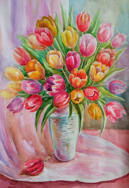 Картины выполнены разными художественными материалами – акварель, гуашь, масло, батик, пастель.
