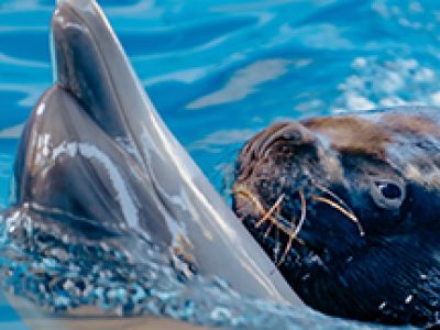 Вас ждёт увлекательное и красивое шоу, в котором участвуют — черноморские дельфины, белые киты, морская львица. После шоу каждый желающий может сфотографироваться с понравившимся артистом и даже поплавать с дельфинами. Наша команда — именитые артисты: Дельфины: Гео, Ника, Эра, Новик, Нельсон, Комета. Морской лев: Знакомьтесь, это Тимон. Он ещё довольно молодой лев, но уже настоящий артист и профессионал своего дела. В Тимоне гармонично сочетаются и уживаются такие черты характера, как хитрость и гордость. Это лев с королевскими повадками, но при этом очень предан своему тренеру. Белухи: В нашем шоу участвует 2 белых, северных кита-гиганта. Гоша. Ему 12 лет. Хотя Гоша имеет степенный, мужской характер, это не мешает ему перенимать некоторые привычки и поведенческие навыки у дельфинов. Что делает его более общительным и контактным и всеобщим любимцем публики. У Гоши солидный вес — около 2,000 кг, а длина более 5 метров. Его подруги по команде Глаше тоже 12 лет. Она довольно любопытная и весьма темпераментная