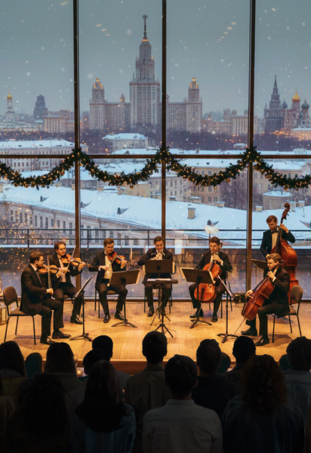 В декабре тёплая панорамная крыша в сердце столицы превращается в уютное рождественское гнёздышко над городом. Здесь звучат песни, под которые Кевин из «Один дома» украшал ёлку, герои «Реальной любви» признавались в чувствах, а Ипполит грустил на заснеженной улице. Оркестр SVET BLACK и певица Елена Андреева создают живую саундтрек-вселенную, где «Jingle Bells» встречается с «Тремя белыми конями», а «Last Christmas» — с «Иронией судьбы».Каждый трек — сцена, каждая мелодия — эмоция. От лёгкого свинга до русской лирики, от смеха до тишины со свечами в руках. В какой-то миг музыка словно сходит со сцены, остаётся одно большое дыхание, один мотив, в котором каждый узнаёт себя… Но пока тсс… Это сюрприз, ещё одно маленькое новогоднее