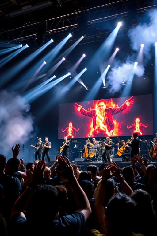 На сцене – мощные динамики, прожекторы, которые словно живые существа прочерчивают пространство яркими лучами, а из дымовых пушек поднимаются таинственные клубы.