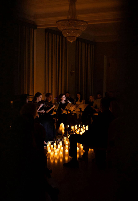 Главные темы большого экрана в звукеКамерный вечер музыки большого кино в историческом особняке XIX века при свечах. Живой ансамбль (фортепиано, две скрипки, виолончель и перкуссия) исполняет главные темы из «Интерстеллара», «Игры престолов», «Властелина колец», «Пиратов Карибского моря», «Призрака оперы», «1+1» и других фильмов. Локация Особняк Прове-Калиш на Новой Басманной: зал с лепниной, высокими потолками и сотнями свечей, всего 100 мест и атмосфера закрытого показа. Приветствие (Welcome)Гости приглашаются за 30 минут до начала, вас ждёт приветственный напиток (welcome drink) и лёгкие угощения — время войти в атмосферу и сделать фотографии (к вашим услугам профессиональный фотограф).