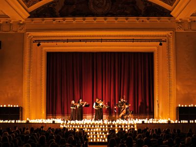 Всё это — в живом исполнении струнных, в обволакивающем тепле свечей, в полумраке, где каждый звук — как луч света на холсте.