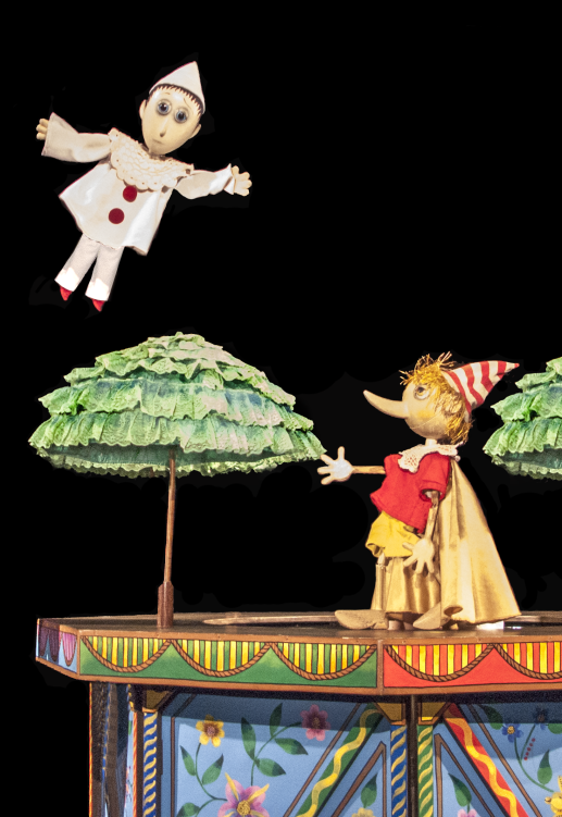 Это спектакль о мечте, о страстной борьбе за ее осуществление.В этом спектакле действуют всевозможные системы театральных кукол – ростовые куклы, перчаточные, тростевые, карнавальные маски.Все действие спектакля происходит во время карнавала на ярмарке в маленьком городке на берегу теплого моря, где артисты танцуют, поют и разыгрывают куклами представление о приключениях деревянного мальчика Буратино и его друзей — грустного Пьеро, нежной Мальвины и храброго пуделя Артемона.Режиссёр-постановщик — Виктор ПлотниковХудожник-постановщик — Марина ГрибановаХудожник-конструктор — Виктор ПлотниковТексты песен — Виктор ЛунинМузыка — Сергей МиролюбовПесня Буратино на стихи Любови ЛукмановойПродолжительность: 1 час 30 минут с