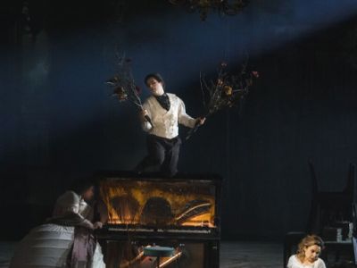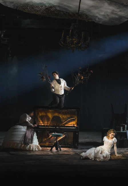 Либретто Петра Ильича Чайковского и Константина Шиловского по одноименному роману в стихах Александра ПушкинаОпера написана в 1878 году, в данной сценической версии впервые представлена в Перми в 2022 годуЭпиграфом к «Евгению Онегину» версии 2022 года стала строфа из пушкинского романа в стихах о том, кем Онегин вернулся из путешествия после смертельной дуэли с Ленским. В постановке Владиславса Наставшевса нет однозначного ответа — кажется, что из всего списка режиссер выбрал характеристику «как вы да я». Его Онегин — а именно он здесь выступает главным героем, а не Татьяна, в привычном понимании читателей и зрителей — одновременно похож на всех и никому не равен. «… Всё кажется зыбко, странно, неопределенно: это спектакль-сон, спектакль-воспоминание. Мучительная рефлексия Онегина о потерянной, бездарно упущенной жизни окрашивает происходящее в ностальгические осенние тона. Самое страшное уже случилось; поэтому спектакль выстроен как лента памяти, разворачивающаяся от конца к началу» (Гюляра Садых-заде, Masters Journal). Воплотить в музыке не ход событий, а психологические портреты героев стремился сам Чайковский — отсюда и определение жанра: «лирические сцены». По словам композитора, он писал не оперу, а «музыкальную иллюстрацию» к «Онегину». Владиславс Наставшевс — латышский композитор и режиссер — слывет «гиперромантиком» и «сторонником аскетичного театра». Для российской публики его открыл «Гоголь-центр», где Наставшевс к моменту пермской премьеры выпустил три драматических спектакля. Первая постановка режиссера на музыкальных подмостках — «Искатели жемчуга» Жоржа Бизе на Камерной сцене Большого театра — была признана критикой одним из центральных событий театрального сезона 2020/21. Пермский «Евгений Онегин» стал дебютом Наставшевса на большой оперной сцене и лауреатом премии «Золотая Маска — 2023» за лучшую режиссерскую работу в опере. Постановка прошла под знаком двойного дебюта: музыкальный руководитель и дирижер Михаил Татарников, отмеченный в конкурсе «Золотой Маски» в личной номинации, также впервые выступил в Пермской опере. Продолжительность 3 часа 10 минут, 2