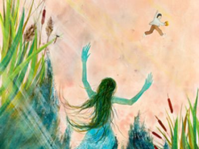 Правительница подземной страны, увидев мальчика, ныряет в воду, а свой Золотой гребень забывает на мостках.