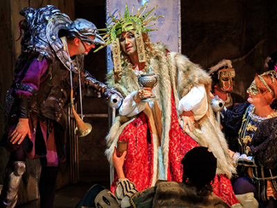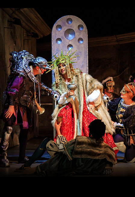Кажется, что персонажи спектакля, облаченные в дорогие ткани и прихотливые маски, словно сошли с полотен старых мастеров.