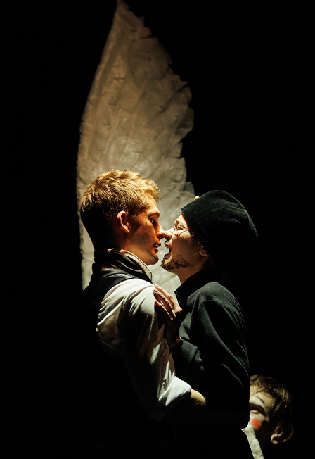 В пустом пространстве сцены Роман Габриа распахивает перед зрителями балаган, обращая страшное – в смешное, демонов – в паяцев, монстров – в карикатуры.