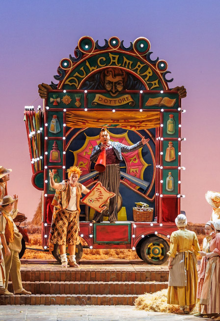 Бродячий лекарь-шарлатан Дулькамара продает влюбленному «любовный напиток», который, тем не менее, позволяет разрешить все проблемы.
