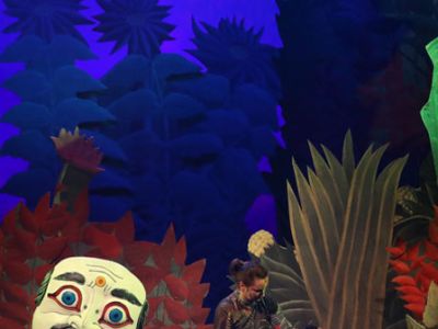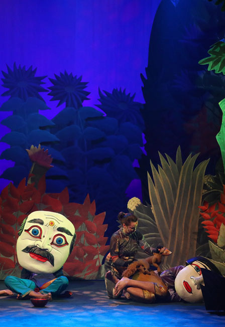 Герои спектакля, представлены на сцене с помощью кукол, масок и необычных костюмов.