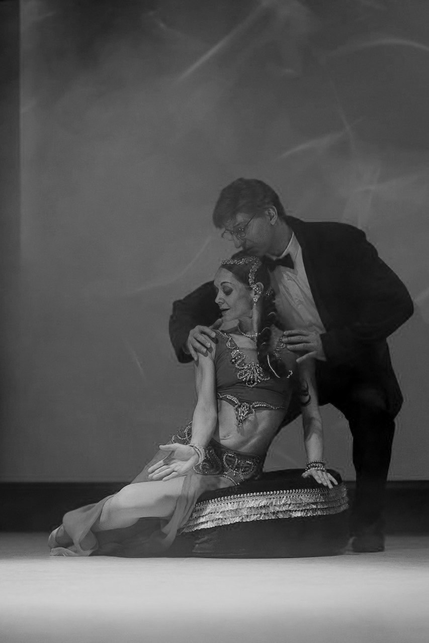 На сцене - загадочная танцовщица с гирляндами цветов на груди, в подлинном восточном головном уборе, закутанная в покрывала цветов красоты, любоцеломудрия, чувственности и страстности.