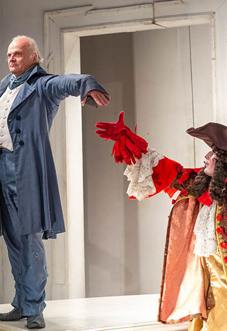 Жан-Батист МольерПеревод с французского Михаила ЛозинскогоПремьера — 22 января 2008 годаКомедия, в двух актахРежиссёр-постановщик — заслуженный деятель искусств Карелии Андрей АндреевХудожник-постановщик — заслуженный художник России Владимир ФирерХудожники по свету — Гидал Шугаев и Рада ТашкиноваСценическое движение — Игорь КачаевМузыкальное оформление — Владимир БычковскийДействующие лица и исполнители:Госпожа Пернель Заслуженная артистка России Елена Соловьёва Оргон Дмитрий СутыринЭльмира Наталья ПаллинДамис Александр АндреевМарианна Юлия ШубареваВалер Денис Цыганков/Александр КоневКлеант Заслуженный артист России Пётр Журавлёв Тартюф Заслуженный артист России Сергей Барковский Дорина Заслуженная артистка России Екатерина ДроноваГосподин Лояль Андрей ЗарубинМонах; Офицер Никита КруглякФлипот Ксения Ирхина/Наталья МызниковаГосподин Л Станислав ГореловИзвестная пьеса Мольера привлекает театр уже не одно столетие. Но до сих пор мы задаёмся вопросом: кто же такой Тартюф? Образец лицемерия и обмана, подлости и подхалимства? Мелкий плут, пройдоха? Или необычайно талантливый мошенник, сумевший «ослепить» своим обаянием уважаемого отца семейства? Грешник, прячущий истинное лицо под маской праведника? Или обманутый обманщик? Он — и то, и это. Он виртуоз манипуляции и азартный игрок, получающий удовольствия от своей рискованной игры. Сценическое пространство, решённое как шахматная доска, искажённая то ли силой зла, то ли человеческой глупостью, становится ареной комедийного сражения. Кто останется в выигрыше? ! Мошенника разоблачат, глупость накажут, обиженные будут утешены, и вроде бы справедливость восторжествует. Но тартюфы по-прежнему остаются в нашей жизни, они так же неизбежны, как пристрастие людей к лести, фанатизм и желание властвовать над другими. И смеясь над чужой и давней историей, мы невольно соотносим её со временами нынешними. Увы, Тартюф вечен, и каждый век предоставляет ему возможность играть и поставляет тех, кто будет счастлив обмануться. Продолжительность: 3 часа. Спектакль идет с одним
