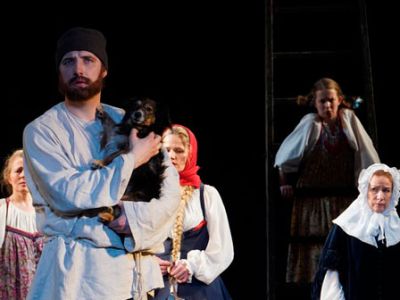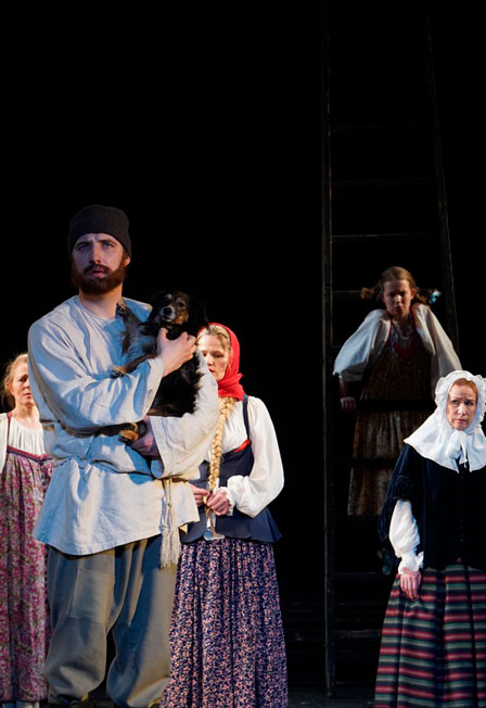 Он начинает рассказ, который подхватывают мужики-скоморохи многоголосыми народными песнями и сценками из лубочного театра.