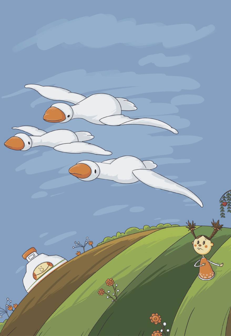 Остались братец с сестрицею дома одни, да вот беда: ослушалась девочка родителей, заигралась и не уследила - унесли братца злые Гуси-лебеди в тёмный лес.
